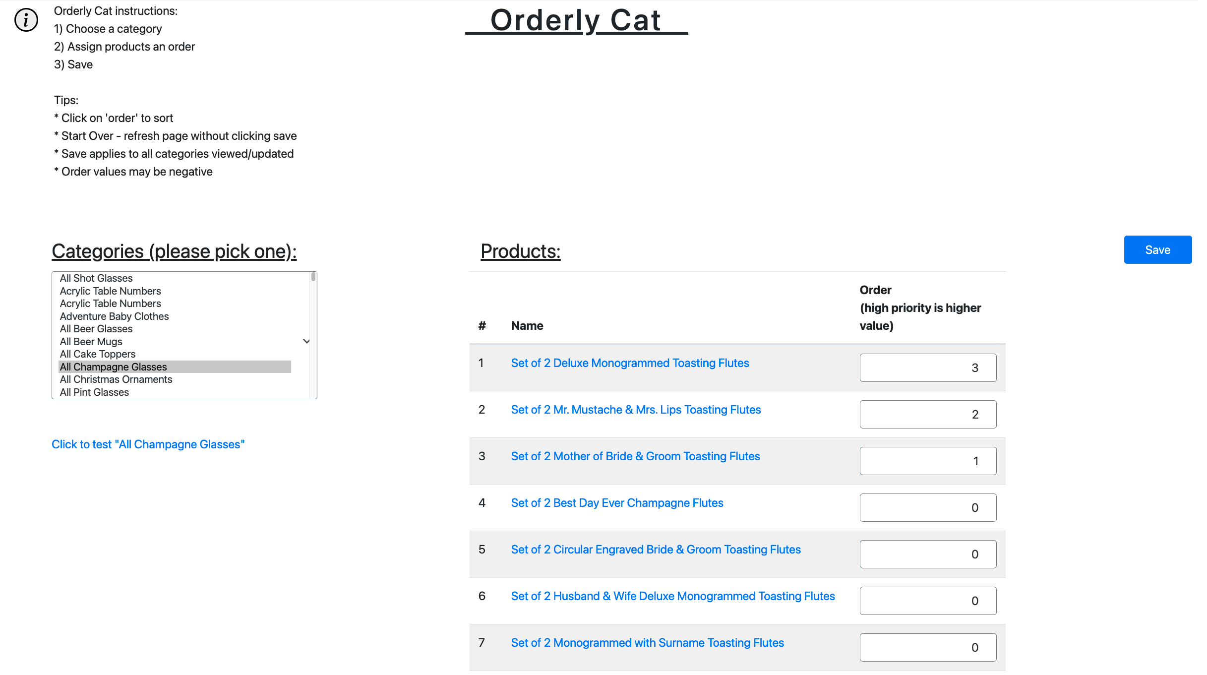 | What? | "Orderly Cat" is a Wordpress plug-in used to organize products within categories. |